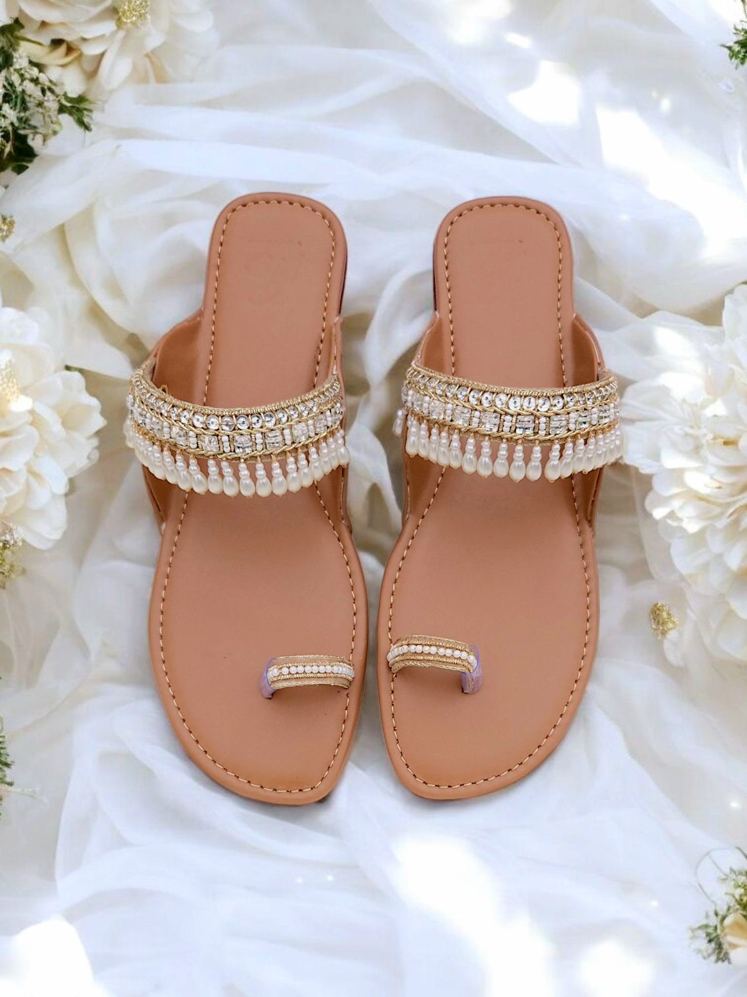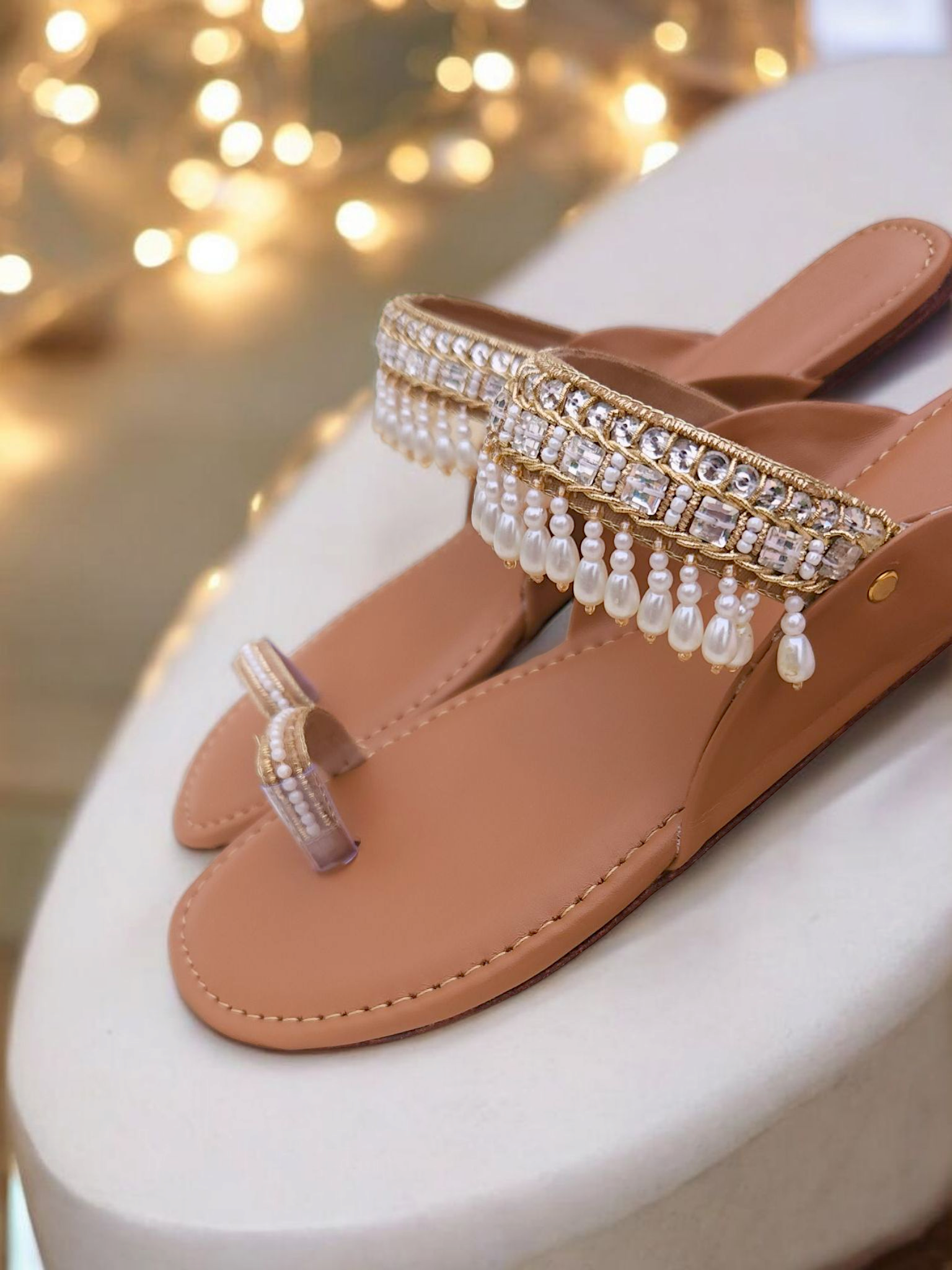 A beautiful amalgamation of tradition and grace in gorgeous shades gold, silver and ivory. Crystal kolhapuris embroidered with gold Dabka and our signature drops in pearls.