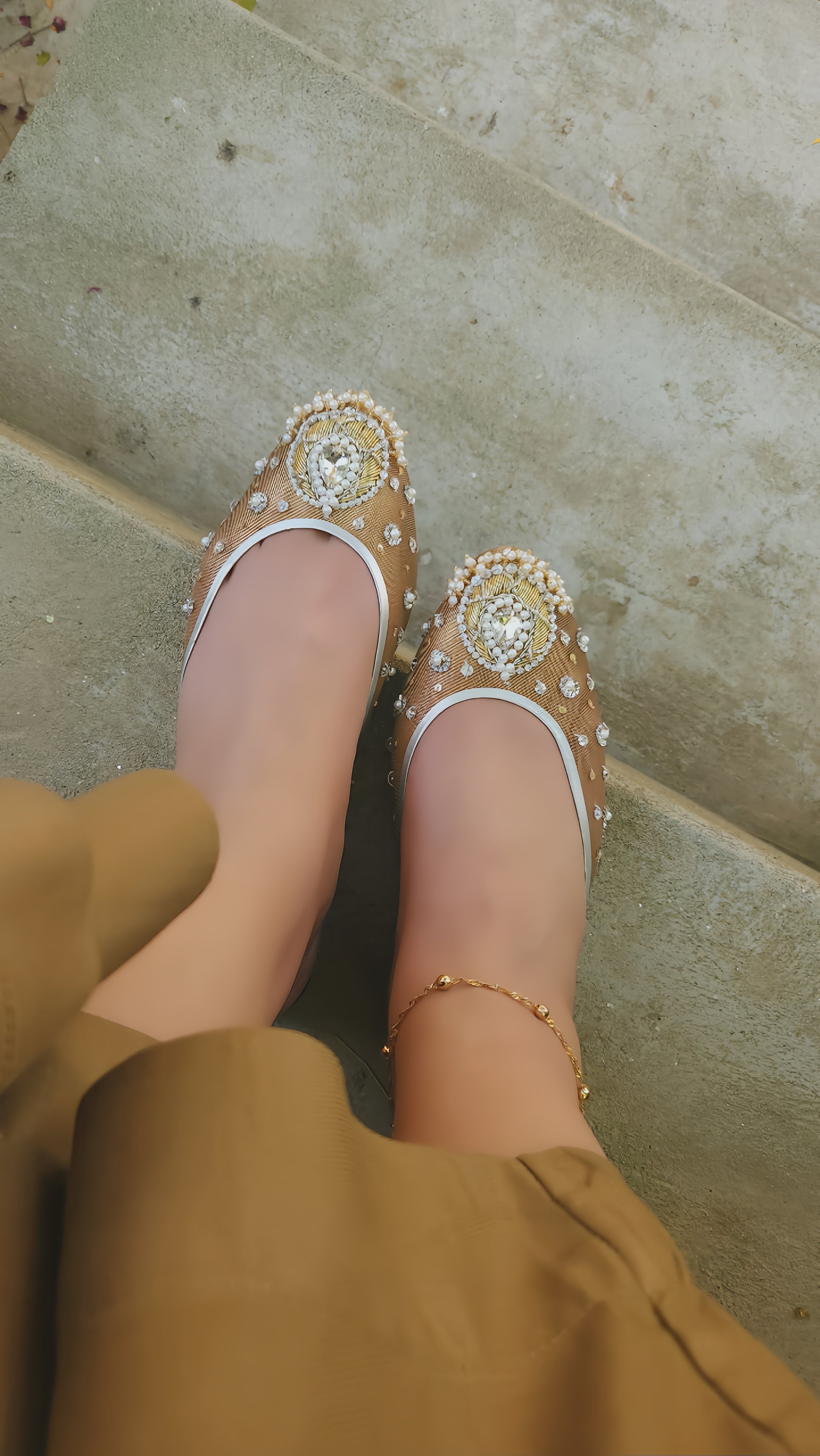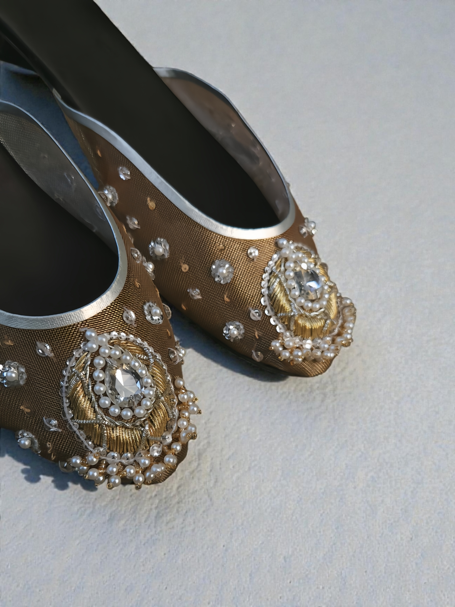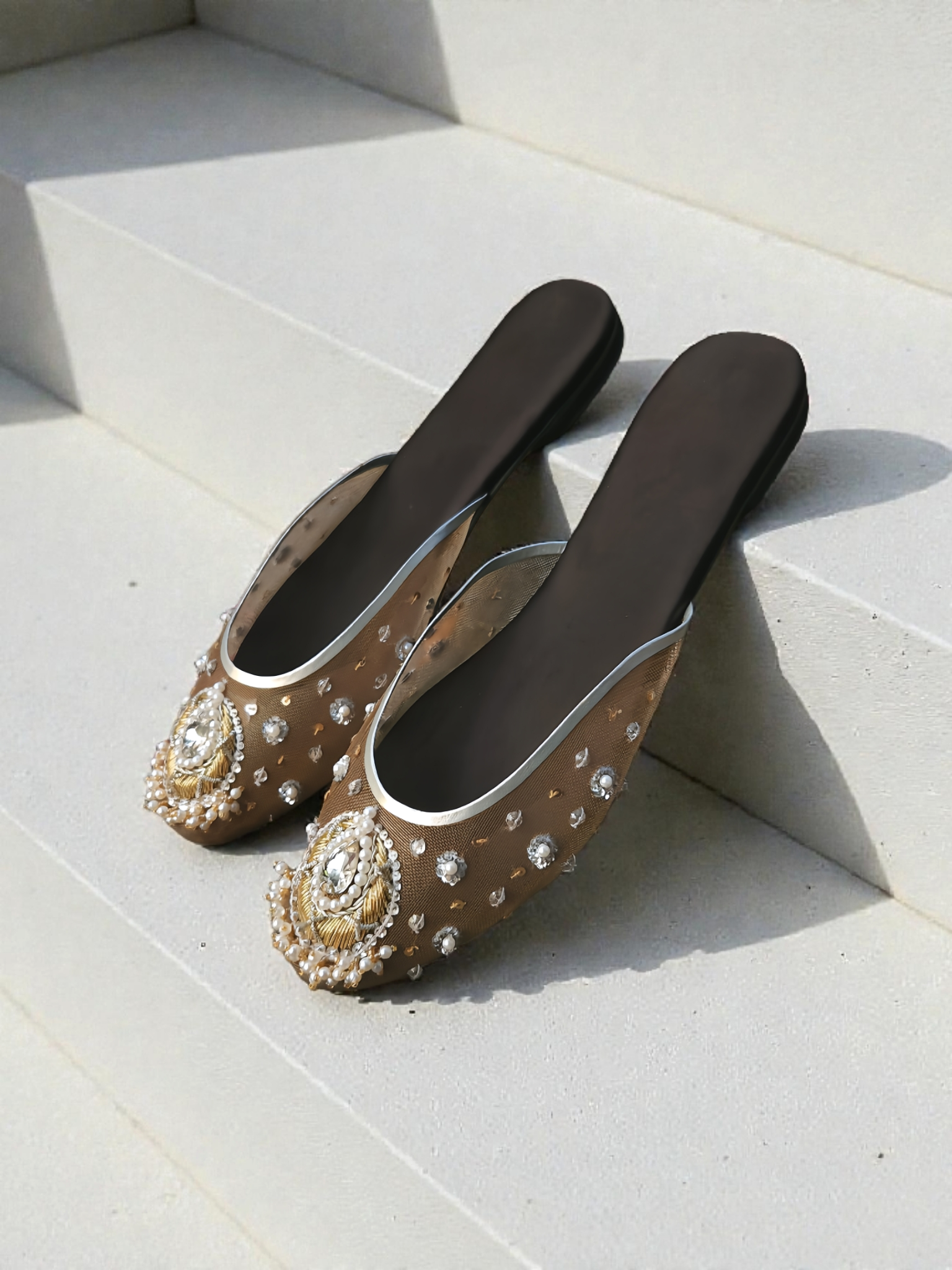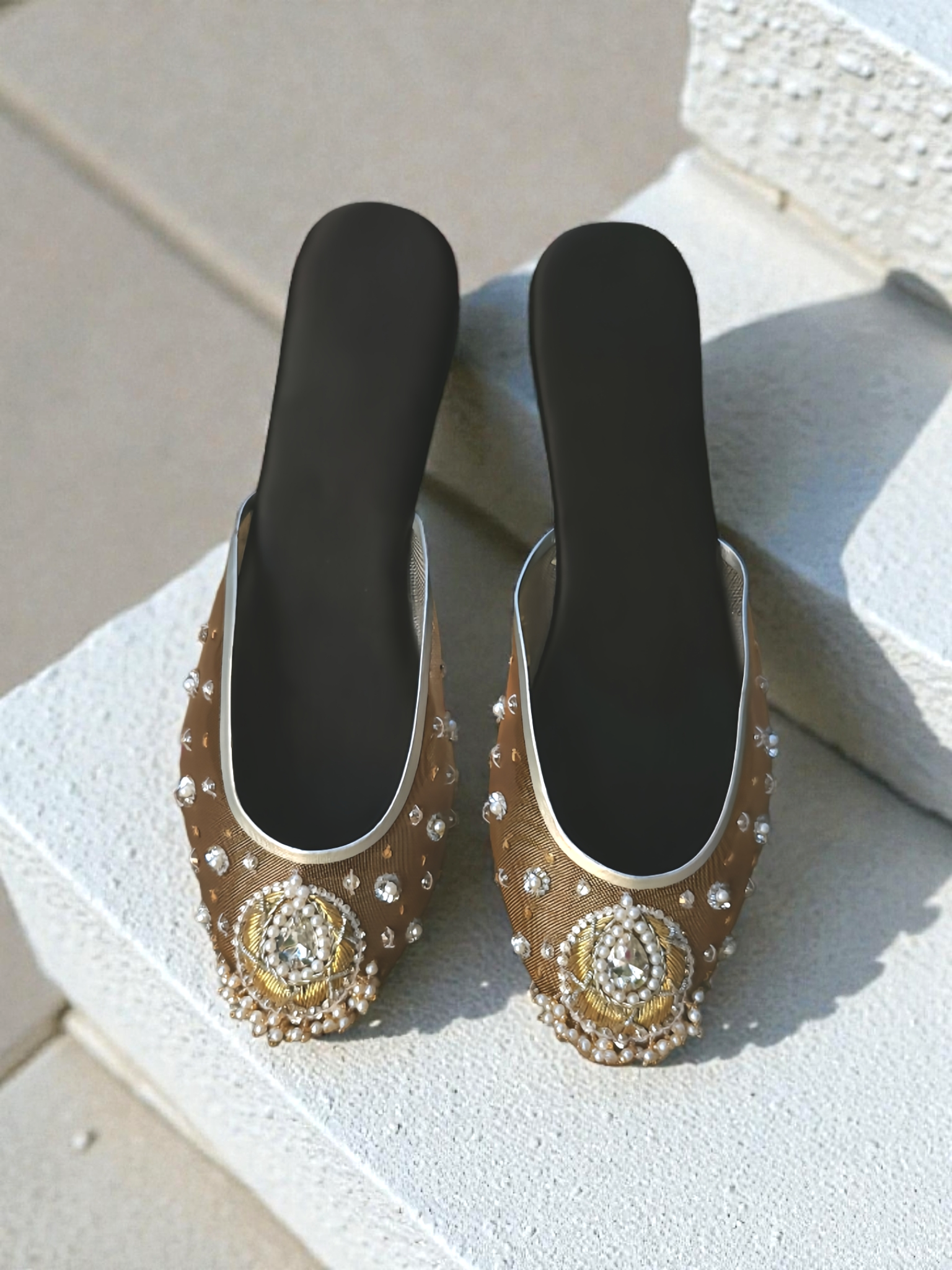 An ode to timeless tradition. Our chaand-bali motif returns in bronze, gold and silver, hand-embroidered to perfection on a sleek black base. A classic mule that forever shines.