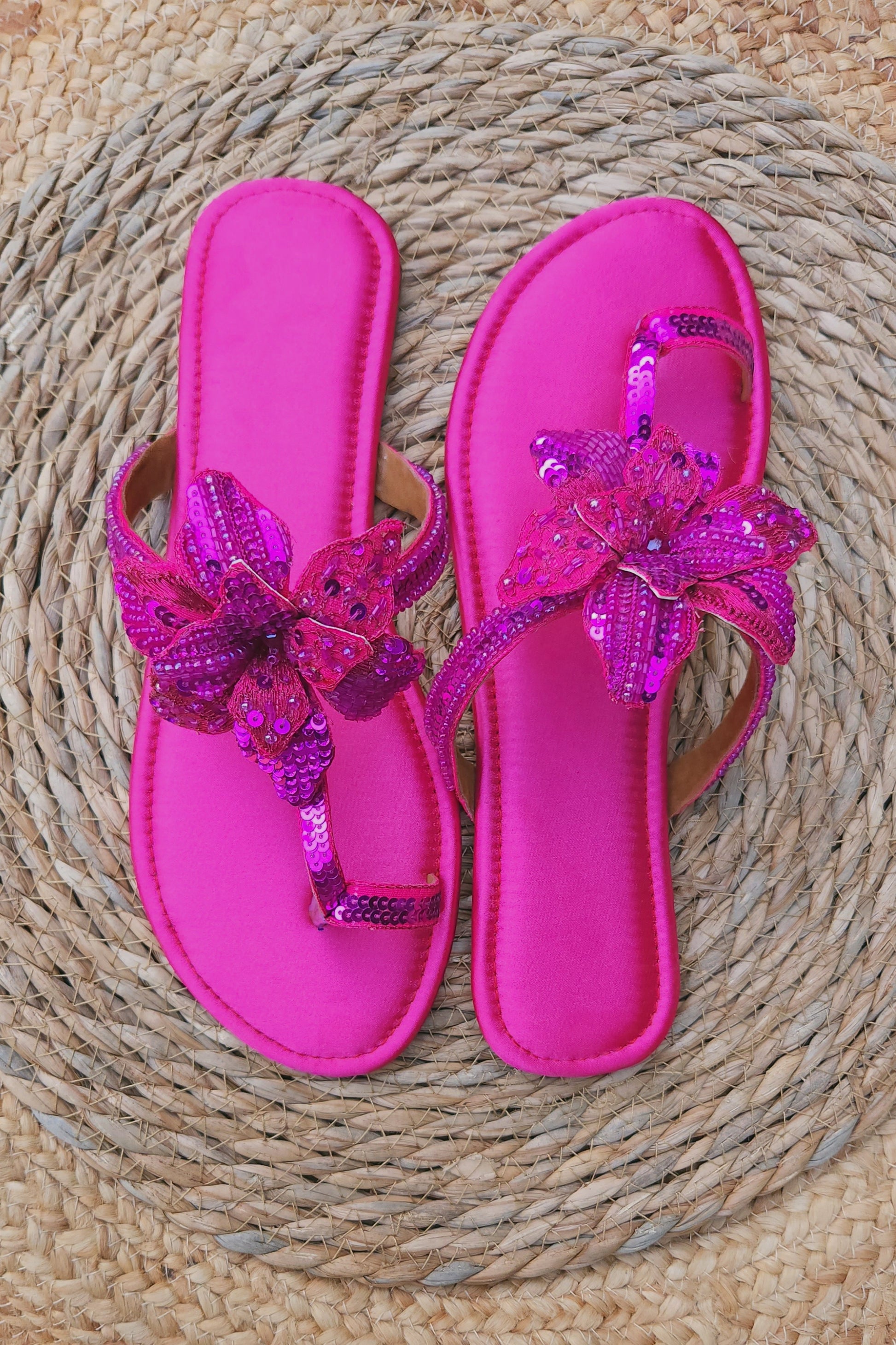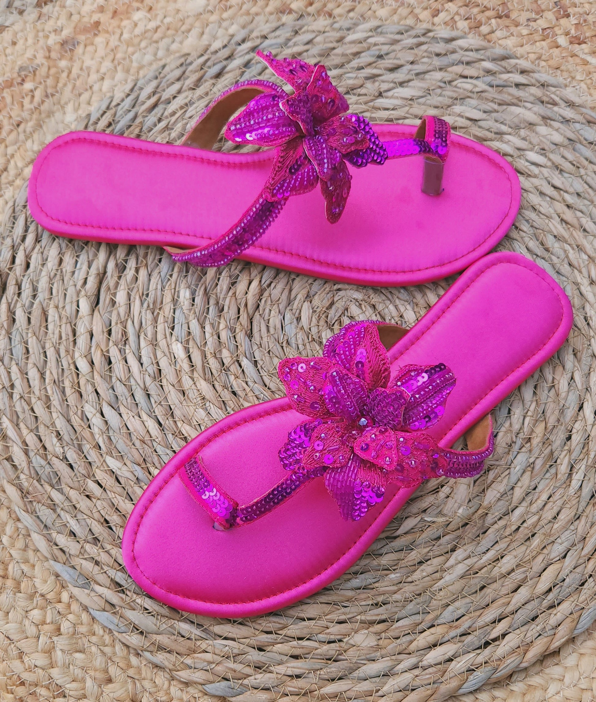 An all over fuschia pair with a gorgeous 3D flower. Every single petal is meticulously embroidered using a variety of materials such as sequins, beads, cut dana, dabka and zari. The petals are then carefully put together to form a 3D flower, further placed on a satin sole.
