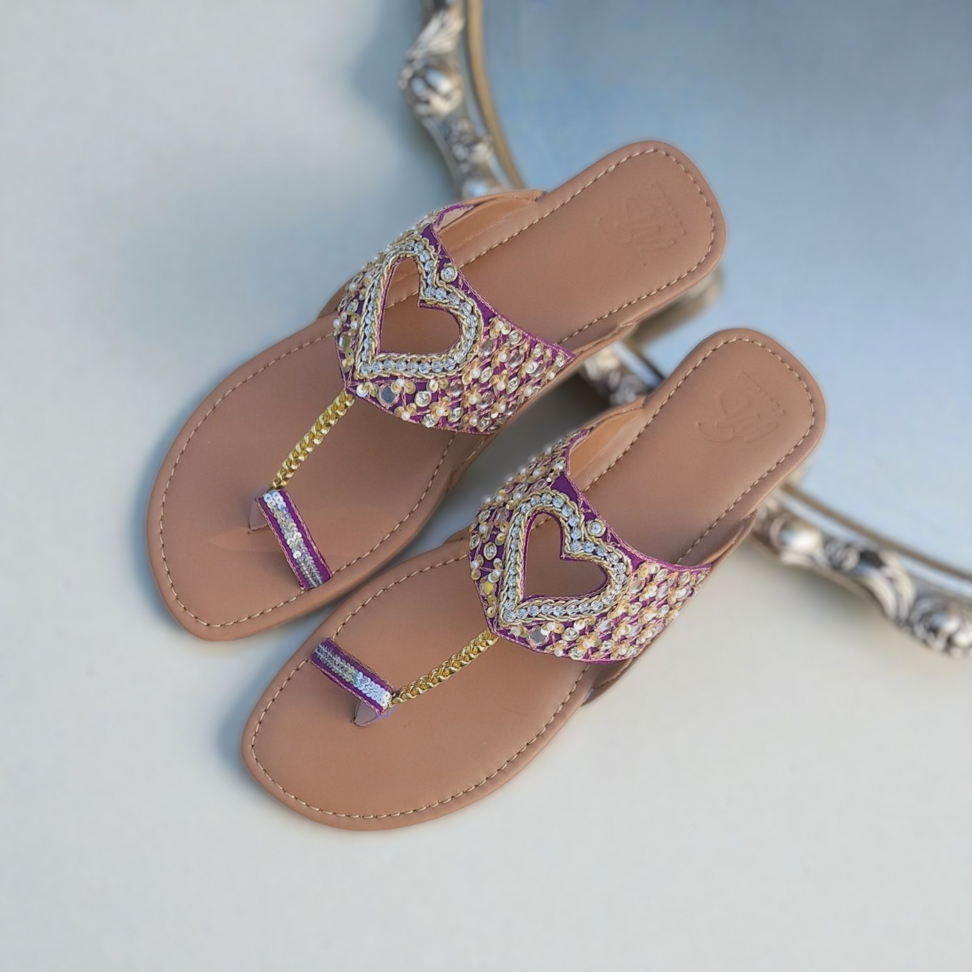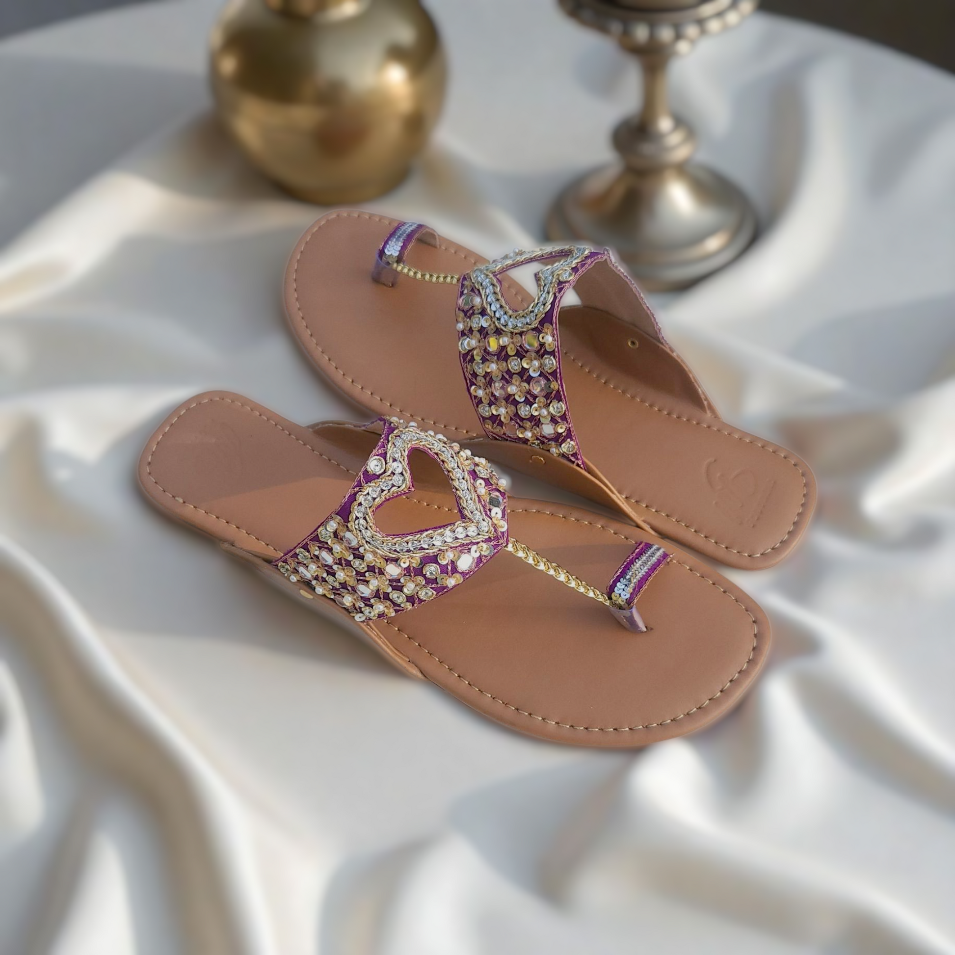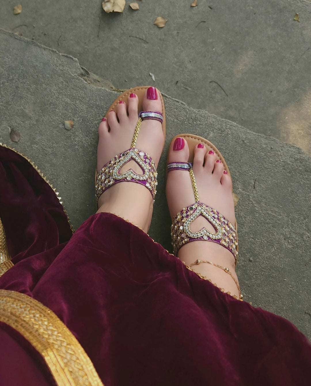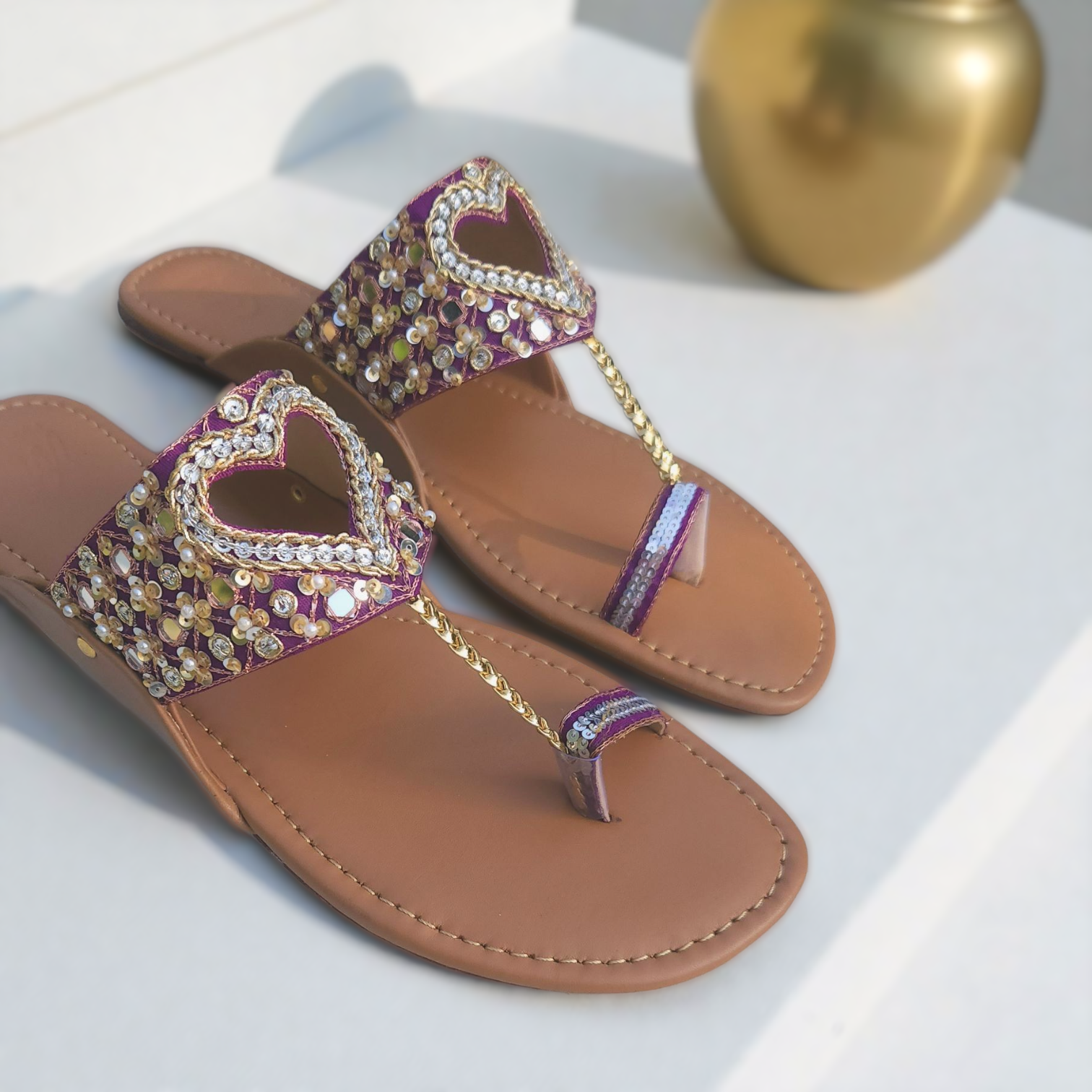 Upper: raw silk base embroidered with mirrors, crystals, dabka, sequins, pearls, zari. The upper is lined with faux suede.