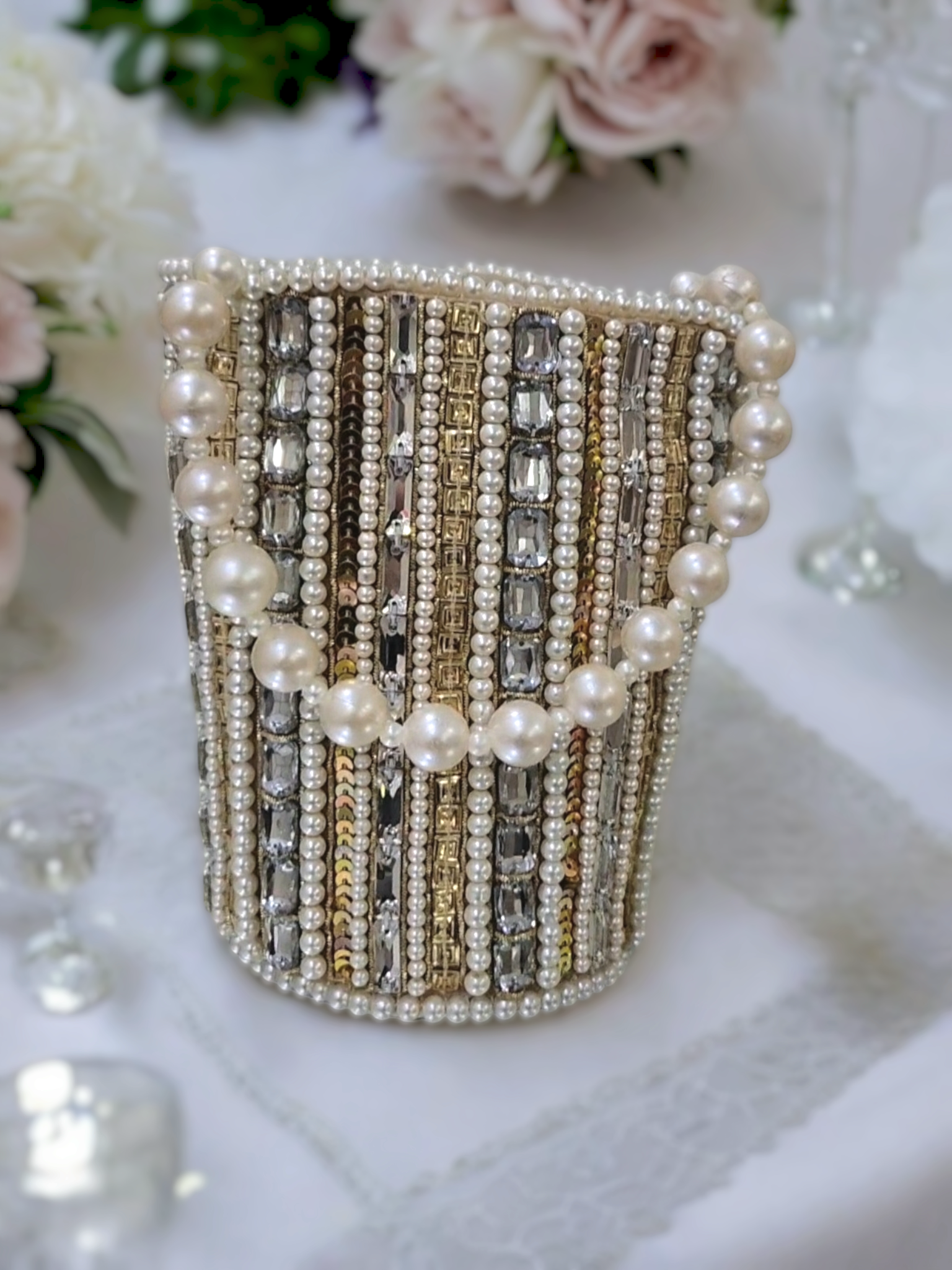An immaculately crafted potli that will be your next "It bag" for all Festive looks. A nude velvet base heavily embroidered with pearls, swarovski stones and dabka and sequins in a linear pattern. The potli has a statement pearl handle.