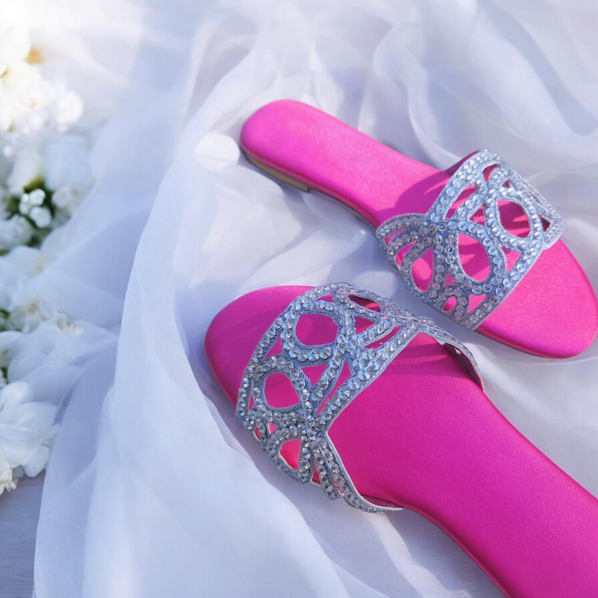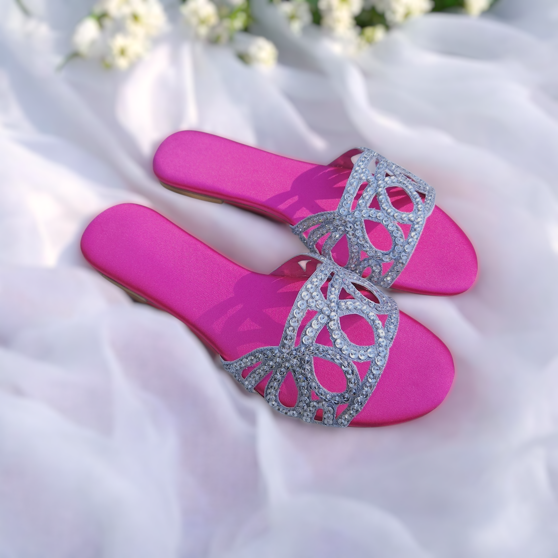 Get ready to turn heads in our glistening cutwork crystal flats. A beautiful fuschia Satin sole adorned with a crystal cutwork pattern.