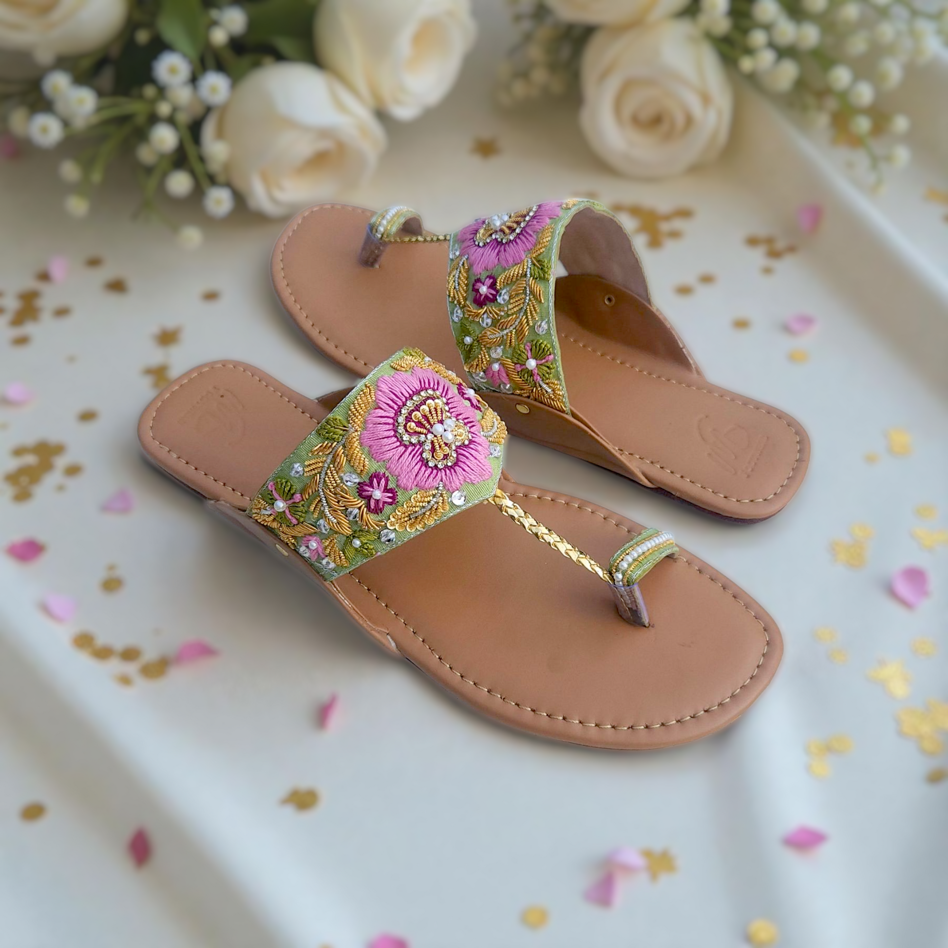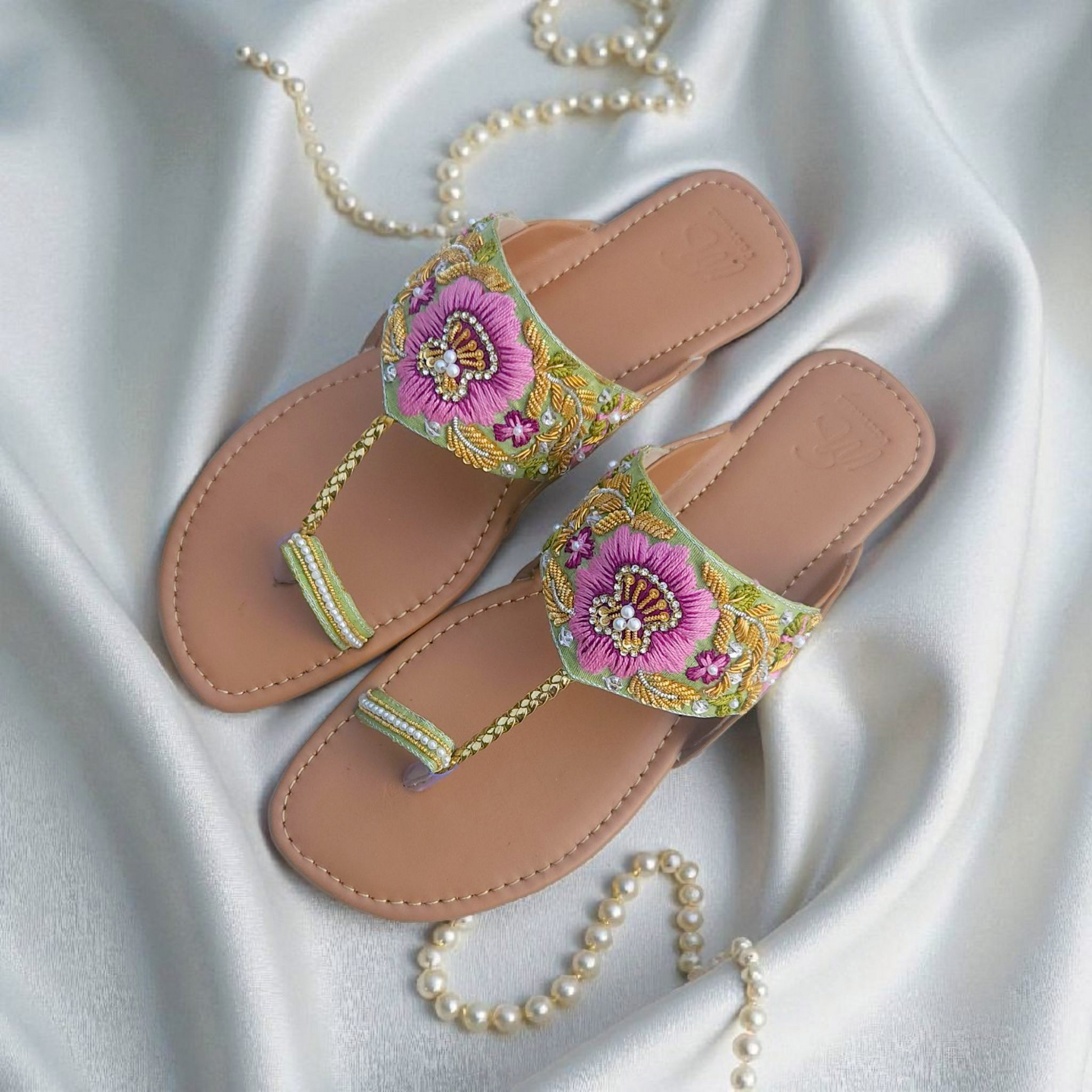 Mahgul kolhapuris are perfect for mehndis. Meticulously hand embroidered in beautiful shades of dhaani green, pink, magenta, gold and silver. Lightweight, comfortable, and full of charm, your go-to pick for festive events.