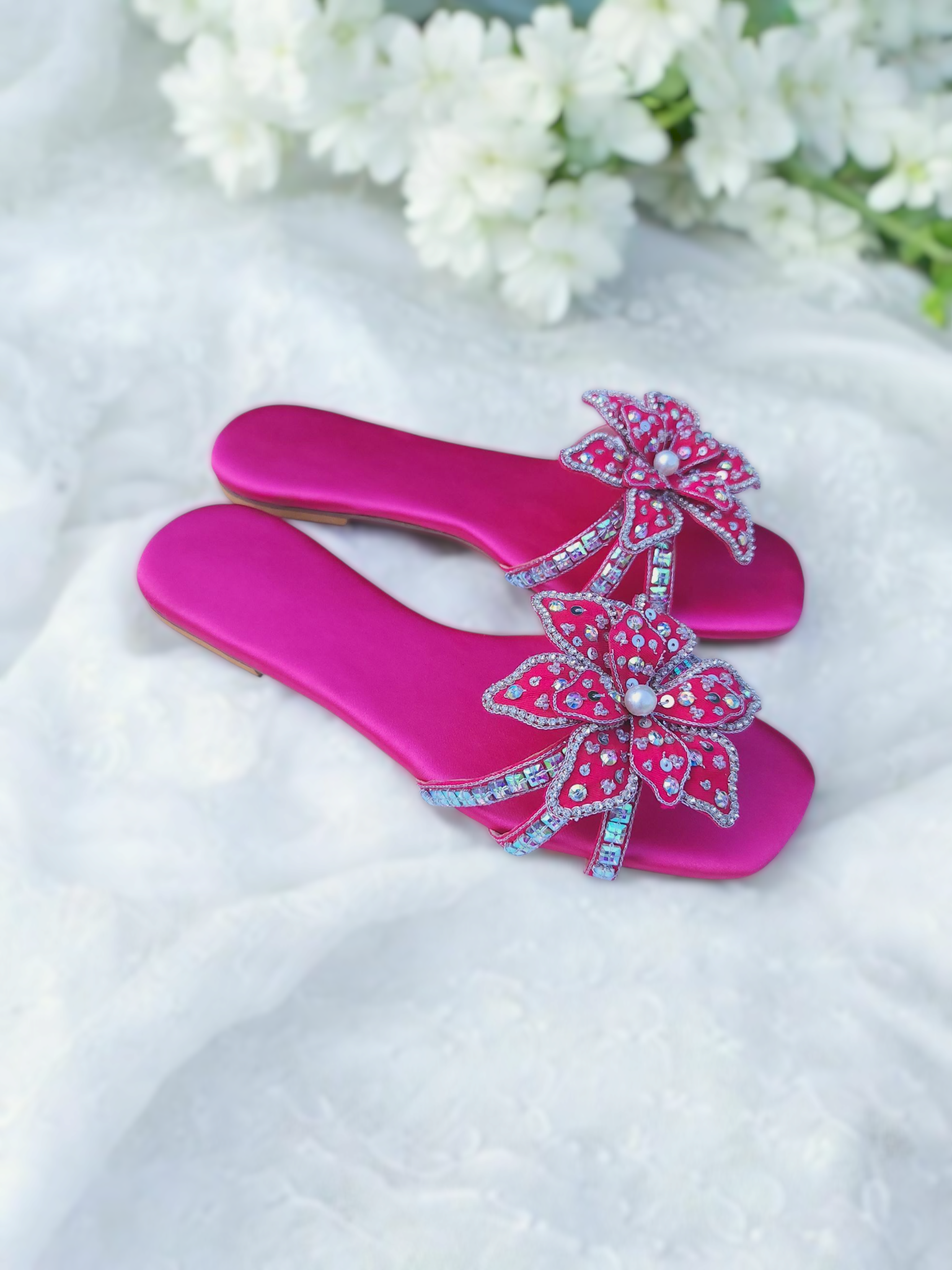 Upper: Fuschia Pink couture flowers with silver and multi shine crystal, pearls and sequins embroidery set on a 3 strap multi shine glass crystal upper.