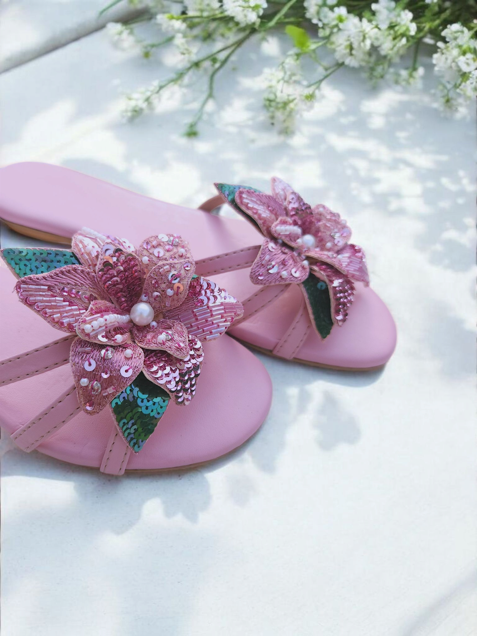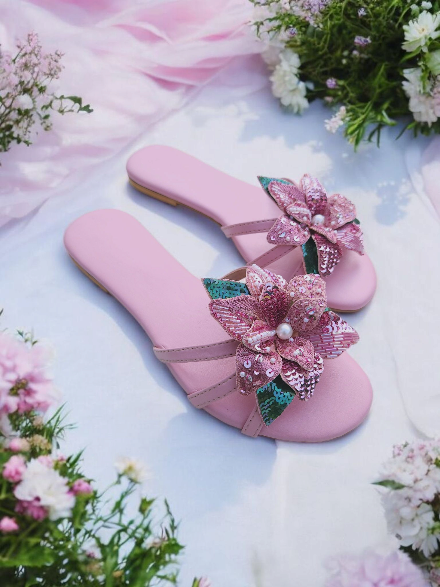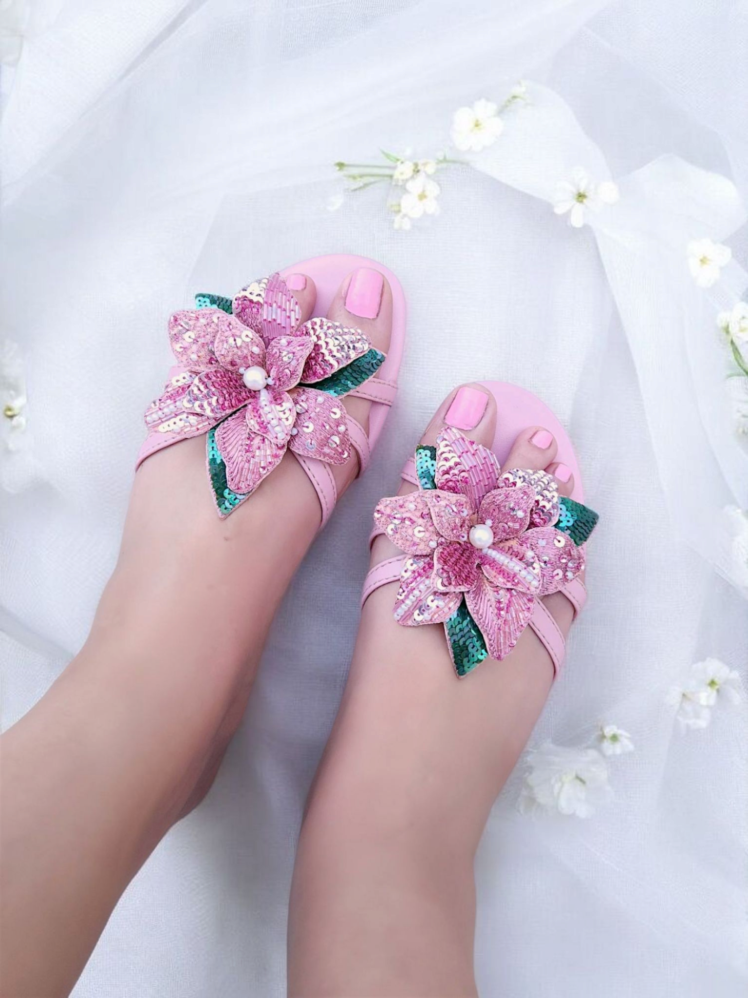 Step into a garden of elegance with our handcrafted Roselle flats. These pastel pink sandals are delicately adorned with an intricate 3D couture floral , featuring sequins, shimmer petals, and pearls meticulously stitched to perfection. This design is made for the modern woman who loves to add a touch of femininity to her every step. Ideal for festive gatherings, summer soirées, or casual chic days out.