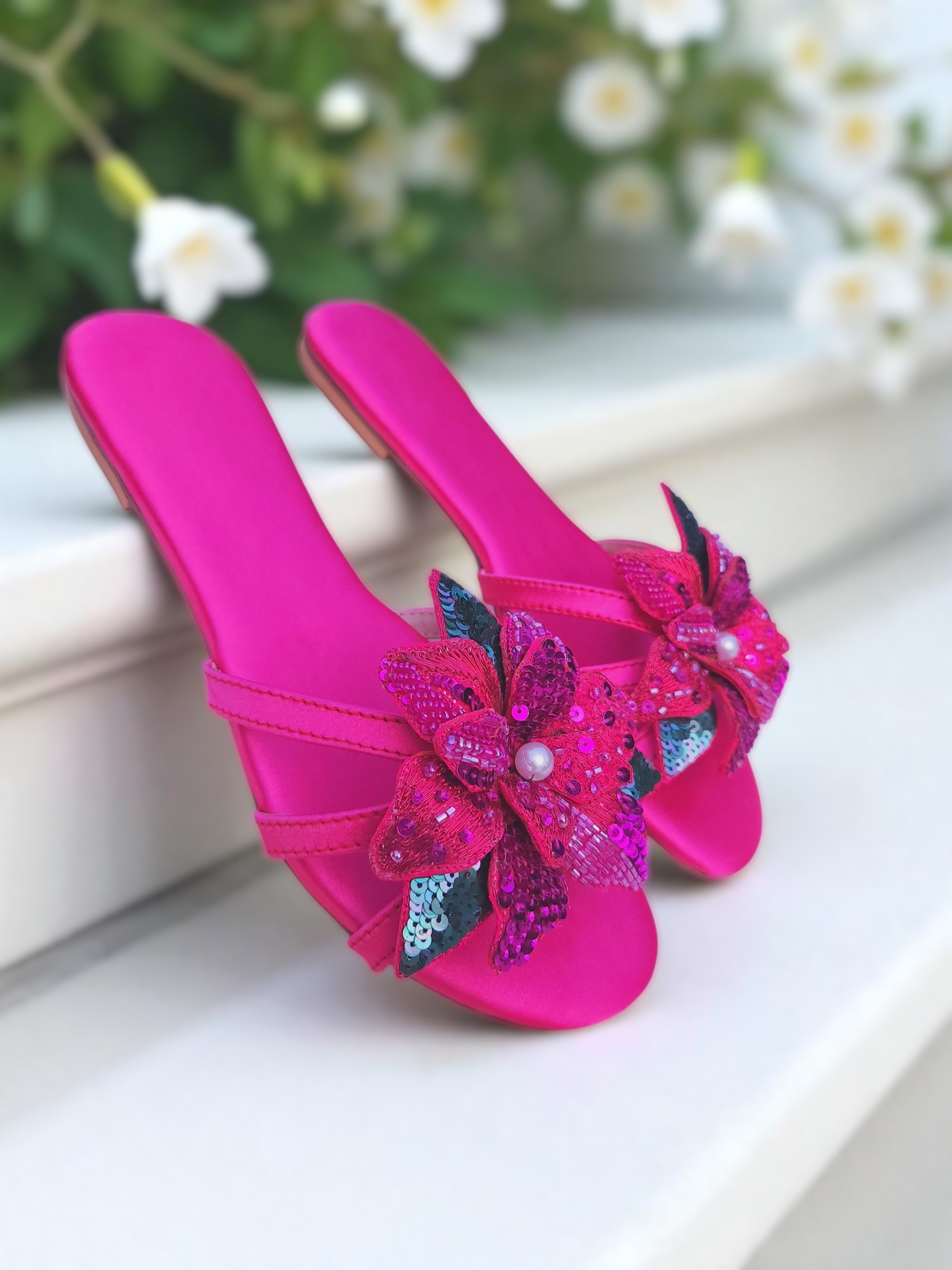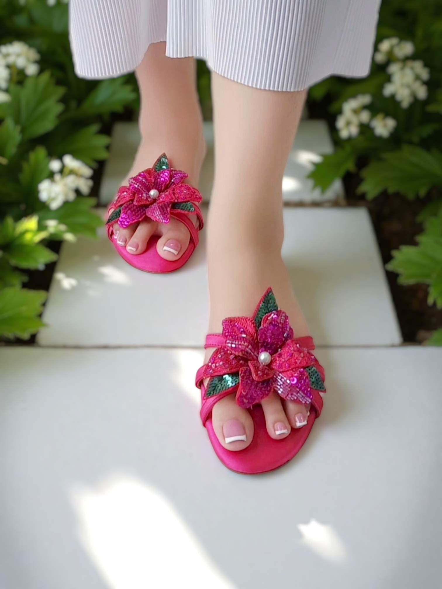 Step into a garden of elegance with our handcrafted Roselle flats. These Fuschia pink sandals are delicately hand embroidered with an intricate 3D couture flower , featuring sequins, beads, crystals and pearls meticulously stitched to perfection. This design is made for the modern woman who loves to add a touch of femininity to her every step. Ideal for festive gatherings, summer soirées, or casual chic days out.