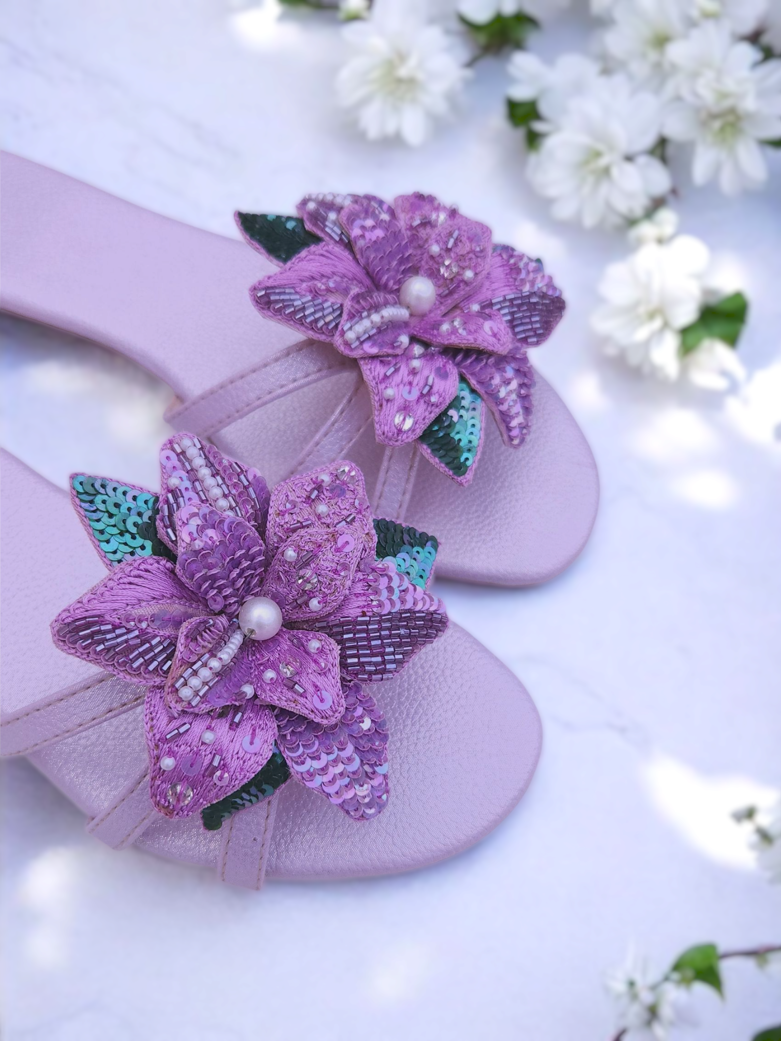 Step into a garden of elegance with our handcrafted Roselle flats. These lilac sandals are delicately adorned with an intricate 3D couture floral , featuring sequins, shimmer petals, and pearls meticulously stitched to perfection. This design is Ideal for festive gatherings, summer soirées, or casual chic days out.