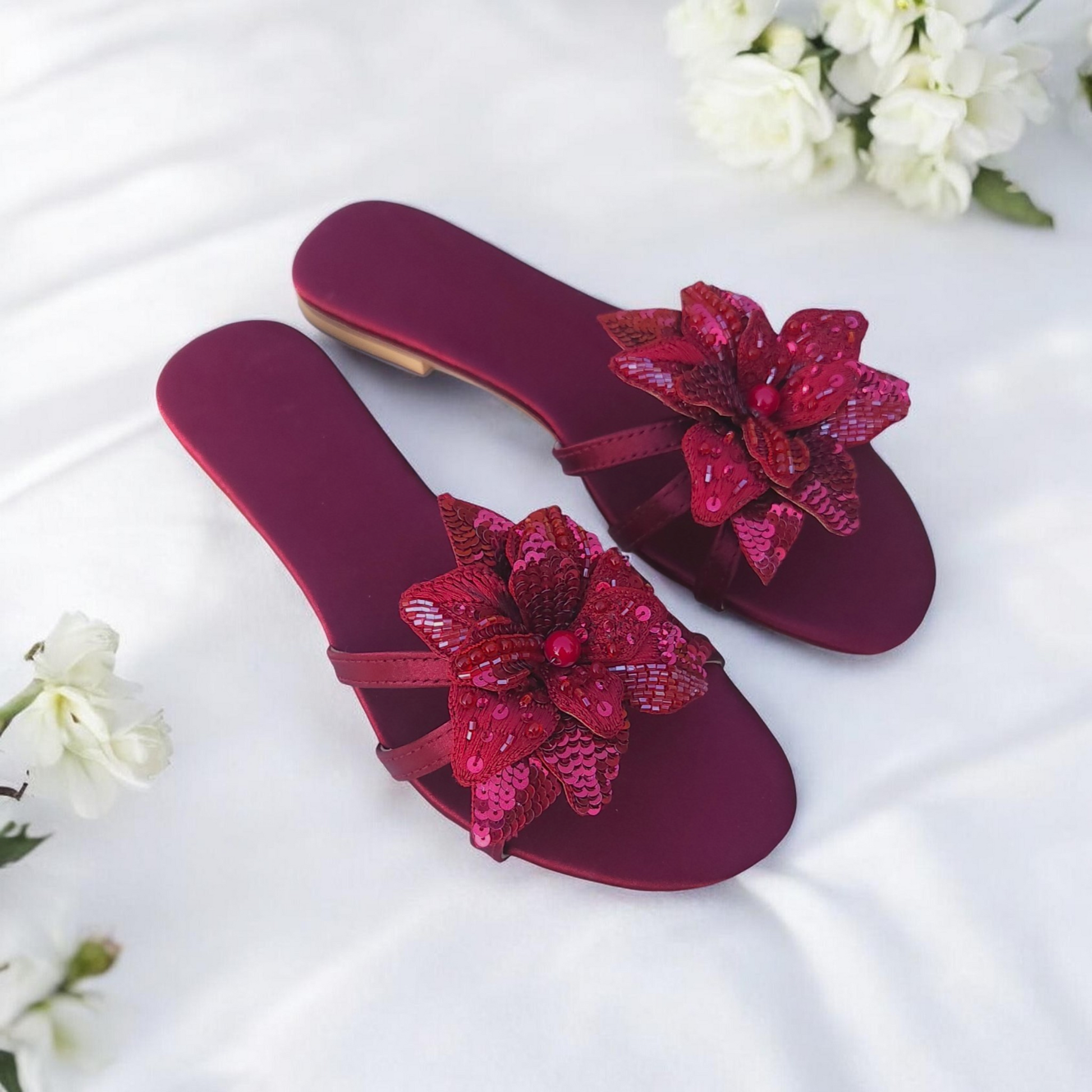 Step into a garden of elegance with our handcrafted Roselle scarlet flats. These sandals are delicately adorned with an intricate 3D couture flower , featuring sequins, shimmer petals, and pearls meticulously stitched to perfection. This design is made for the modern woman who loves to add a touch of femininity to her every step. Ideal for festive gatherings, summer soirées, or casual chic days out.